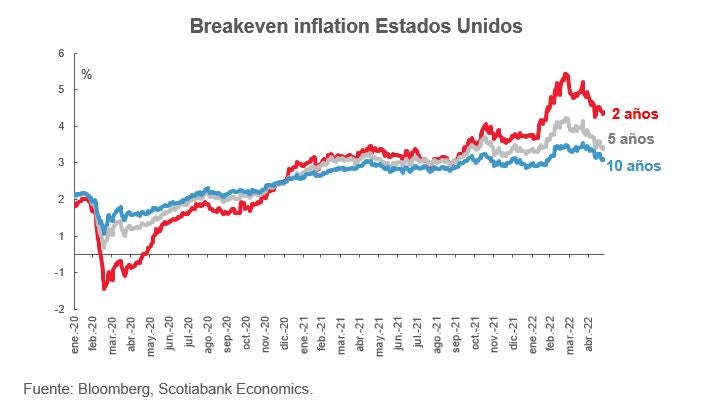 En las últimas semanas las medidas de Breakeven Inflation en Estados Unidos a diferentes plazos, han disminuido. Lo que evidencia que el mercado está empanzado a reaccionar los ajustes en las tasas de política monetaria y a la expectativa de una menor liquidez.