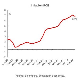 La inflación en EEUU derivada del gasto en consumo (PCE por sus siglas en inglés) se ubicó en 6.3% anual, por debajo de las expectativas del mercado, ya que se esperaba que continuara en 6.6%. Esta caída esta explicada por el descenso en el precio de los automóviles usados y las prendas de vestir.