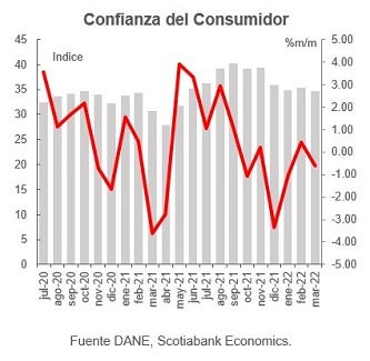 El DANE informó que el Indicador de Confianza del Consumidor llegó a 34.7 durante abril, lo que representa una caída de 0.6 puntos. El deterioro está asociado principalmente a la percepción sobre el futuro de la economía del hogar debido al comportamiento de la inflación.