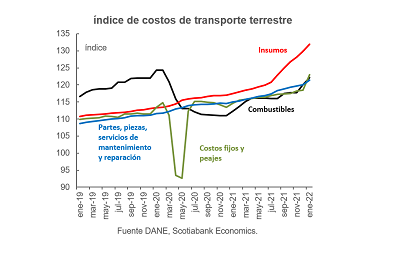 El país ha experimentado en los últimos meses incrementos significativos en los costos de transporte, especialmente en el rubro de los insumos, lo cuales, ante el contexto internacional han venido subiendo. Y es posible que estas presiones sigan por el conflicto geopolítico en Ucrania, ya que cerca del 42% de los fertilizantes para la producción de alimentos son importados de Ucrania y Rusia